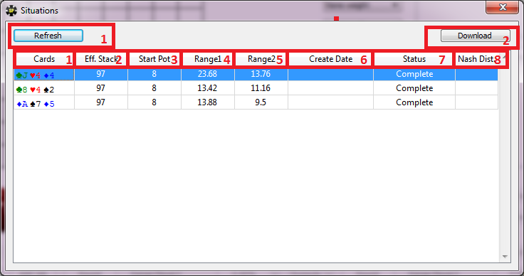 a. Cloud->Situations - открывает окно, где содержатся все флопы, ранее посчитанные пользователем в облаке. Результат продолжает храниться в облаке для удобства пользователя. Любой из флопов пользовать может скачать на локальный компьютер.