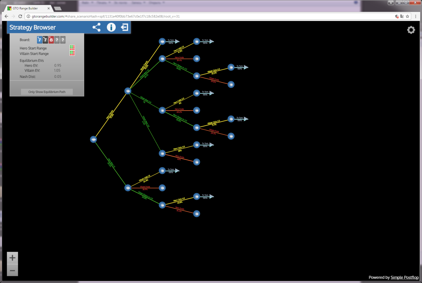 Пример 2 "Переобучение": Допустим на тёрне получили равновесие, что диапазон оппонента при переходе на ривер состоит только из JJ - решая ривер с данным диапазоном наша стратегия будет учитывать, что у оппонента может быть только JJ, при этом если он отклонится от равновесия на тёрне и его диапазон на ривере попадёт какие то другие карты, то он за счёт этого сможет эксплуатировать нашу стратегию на ривере. При использовании расчёта с восстановлением, мы защищены от такой ситуации, наша стратегия на ривере всегда будет строиться таким образом, что бы оппоненту не выгодно было отклоняться от равновесия на тёрне.